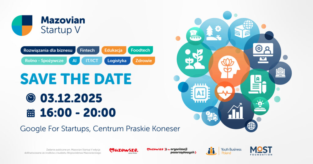 Już 3 grudnia 2025 r. spotkamy się podczas Demo Day legendarnej edycji Mazovian Startup V – programu akceleracyjnego organizowanego przez Urząd Marszałkowski Województwa Mazowieckiego, realizowanego przez Youth Business Poland oraz Fundację MOST.